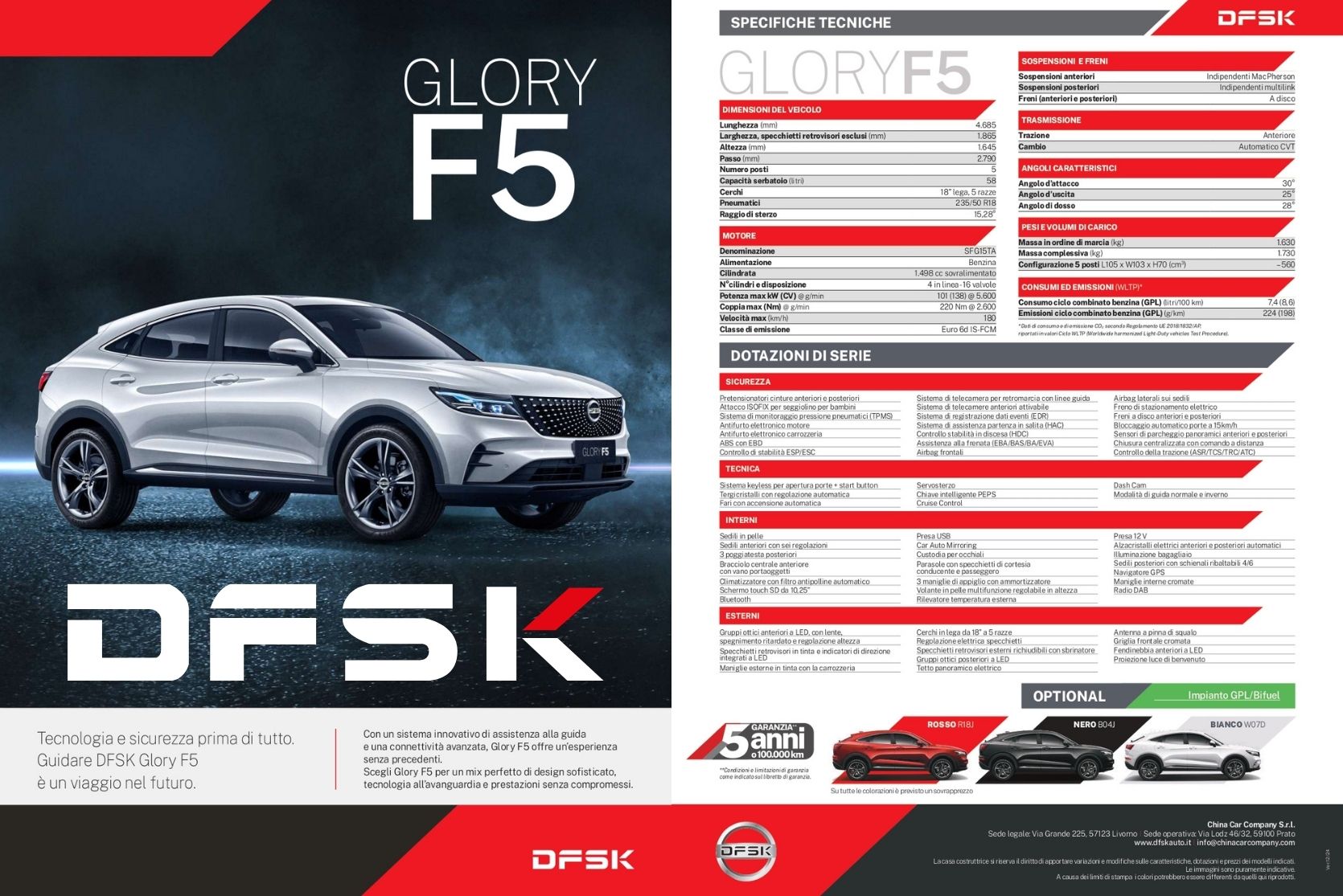 Sì. Grazie a comfort elevato, sedili riscaldati, ampia abitabilità, bagagliaio capiente e doppia alimentazione benzina/GPL, il Glory F5 è adatto anche a lunghi viaggi e utilizzo autostradale.